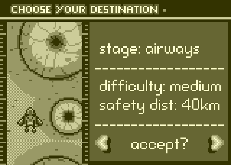 Players could choose any stage from the start. The forest was the easiest, with a safety distance of 30km. Then came the airways, with a safety distance of 40km. Finally, the hardest stage, the factory, had a safety distance of 60km; players had to survive for a long time to reach Station AT-108, all while facing an increasing number of meteorites. There was also a hidden stage: the abandoned roads.
