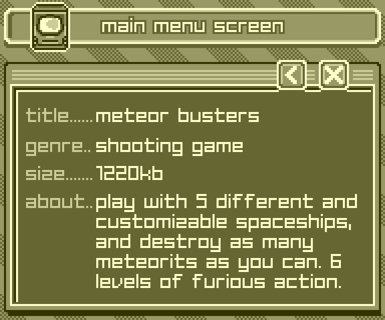 But in the end, only one game made it across the finish line: Meteor Busters. (I'm not counting Escape the Planet, since that one ran on an earlier, smaller version of Pixel Boy). With just a single finished title, the grand vision of People Boy didn't quite pan out, so I ditched the name and brought it back to what it was always meant to be: Pixel Boy.