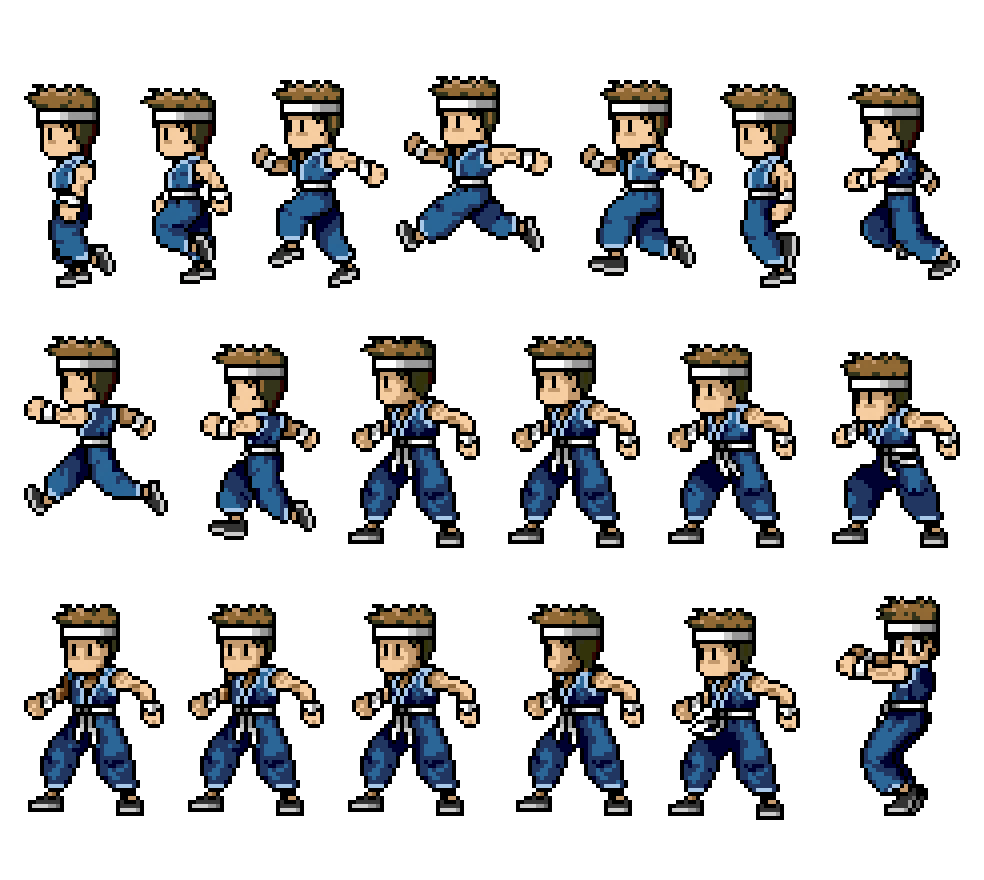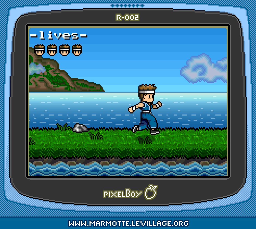 The Pixel Boy saga began in February 2003, when I was experimenting with a platformer prototype starring a blue ninja, titled "Little Shinobi". The prototype itself didn't get too far - our stealthy hero could run left and right, maybe throw in a jump for good measure, but that was about it. Still, I was oddly proud of one particular detail: the way his belt swayed when he came to a sudden stop. That little animation alone made the whole thing feel alive! Looking back, this is probably the earliest appearance of Pixel Boy - a humble beginning for what would later evolve into a full-fledged fantasy console (or at least, that's what I was hoping back then).