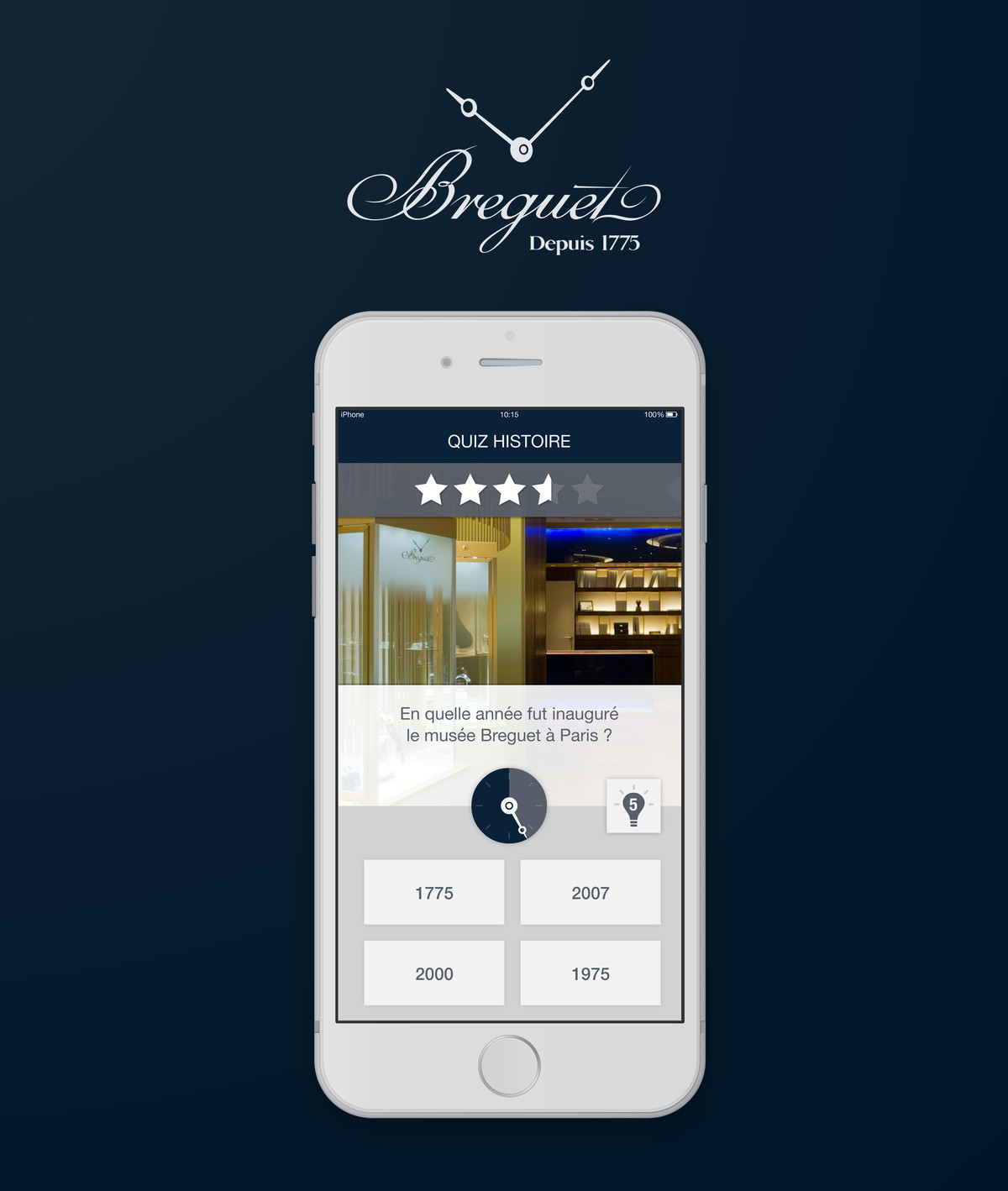 Beyond the quiz, the app would also include a full catalog of Breguet collections, a store locator, and a system to track user engagement, gathering stats like quiz scores, common mistakes, and achievements. The plan was for this app to evolve over time, keeping Breguet's community engaged with fresh content and new brand highlights.