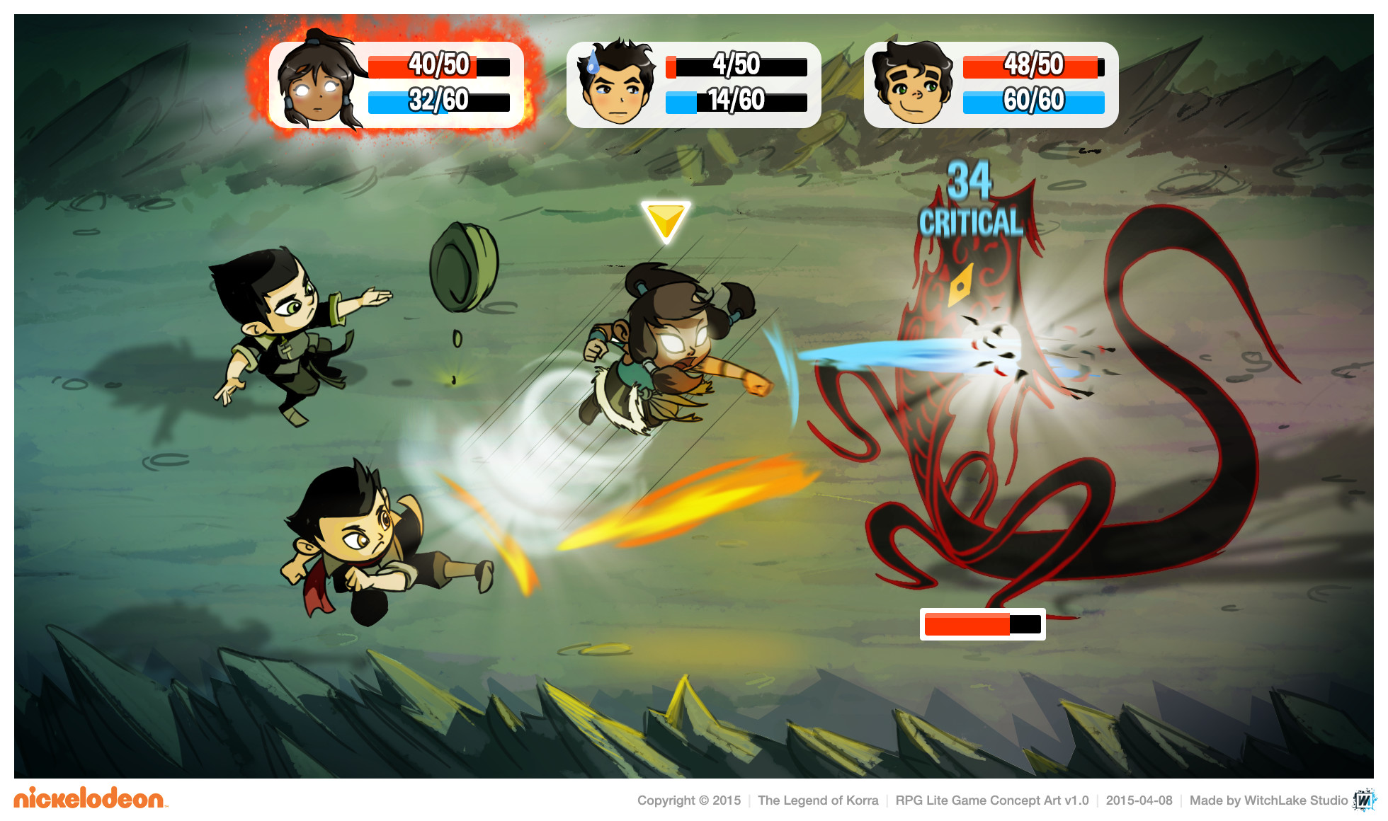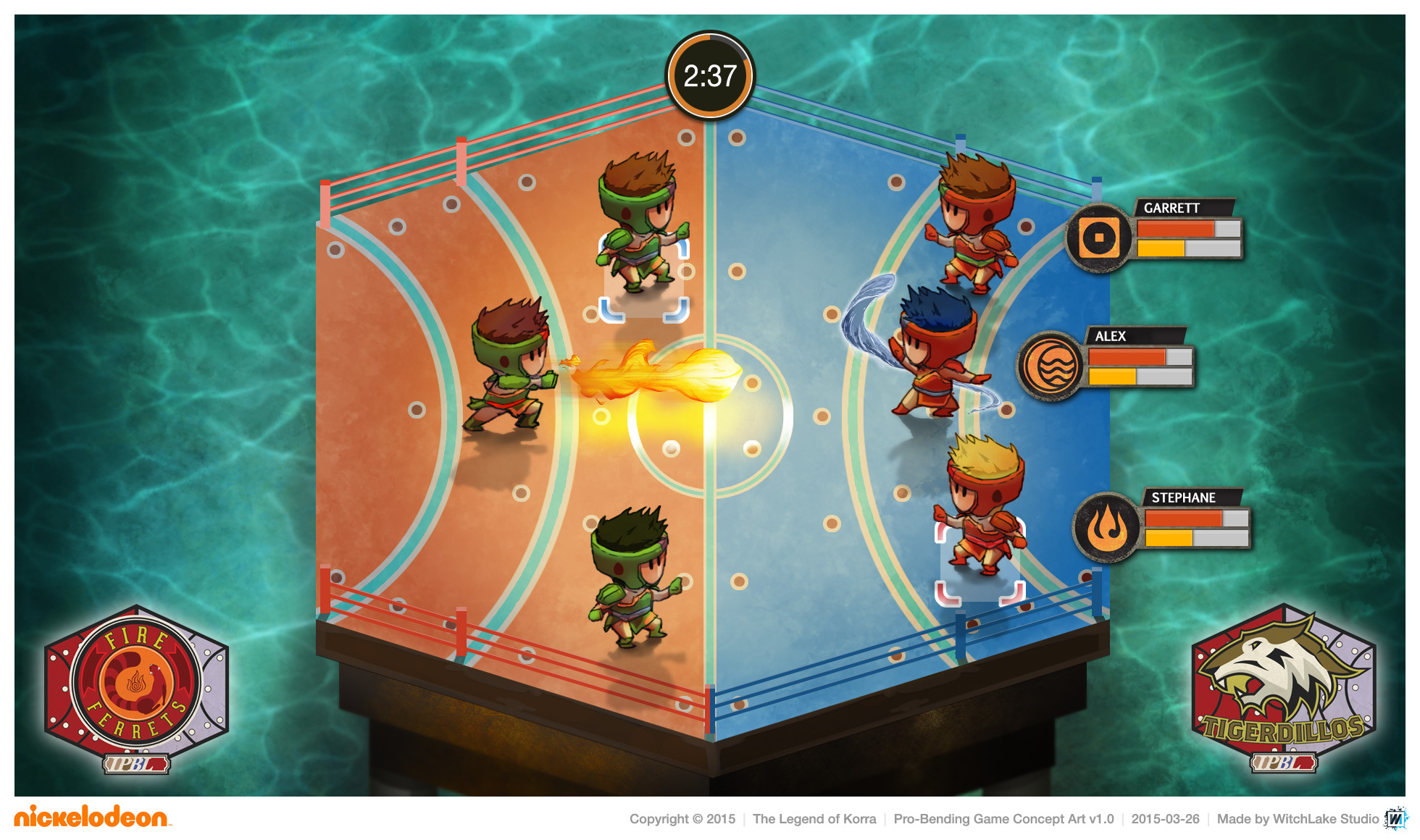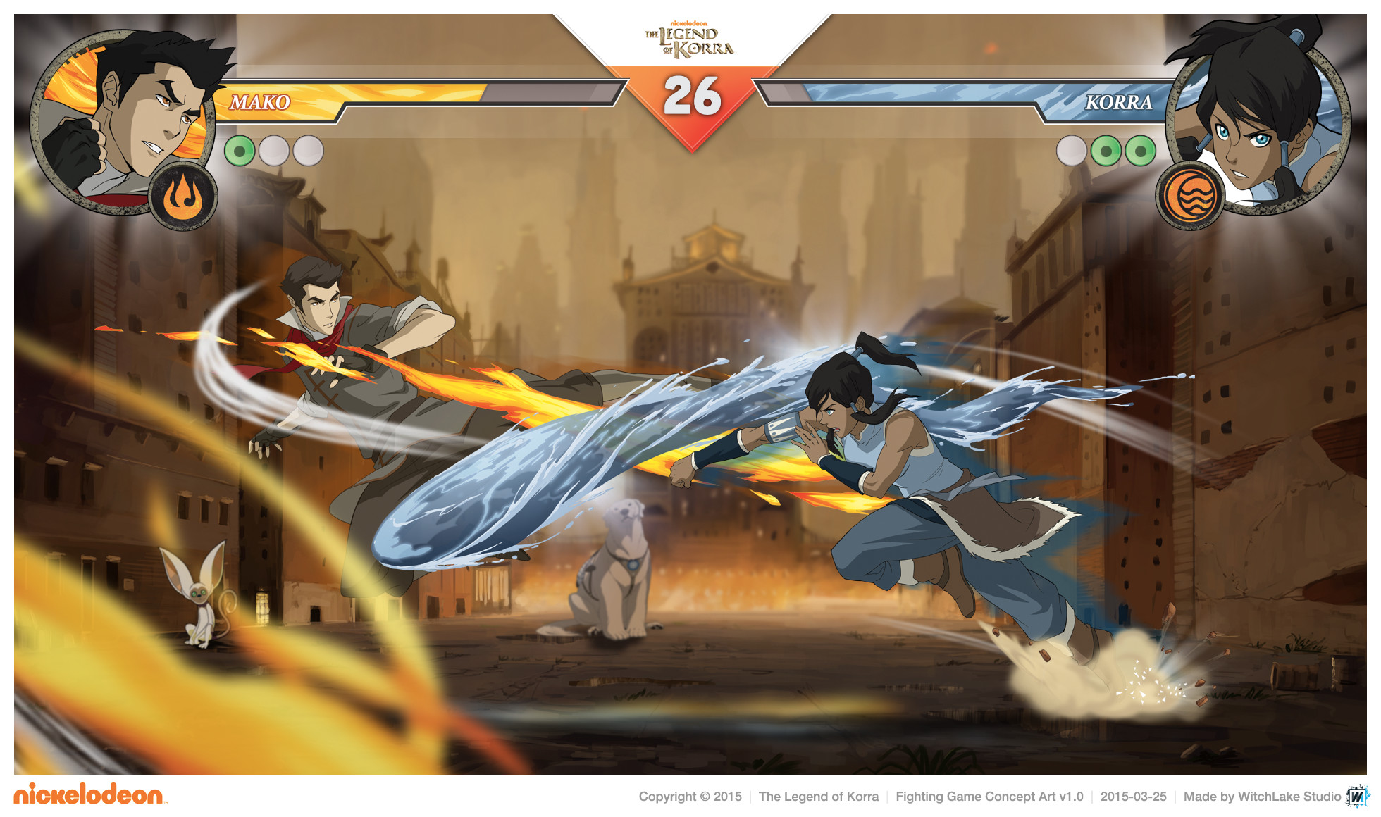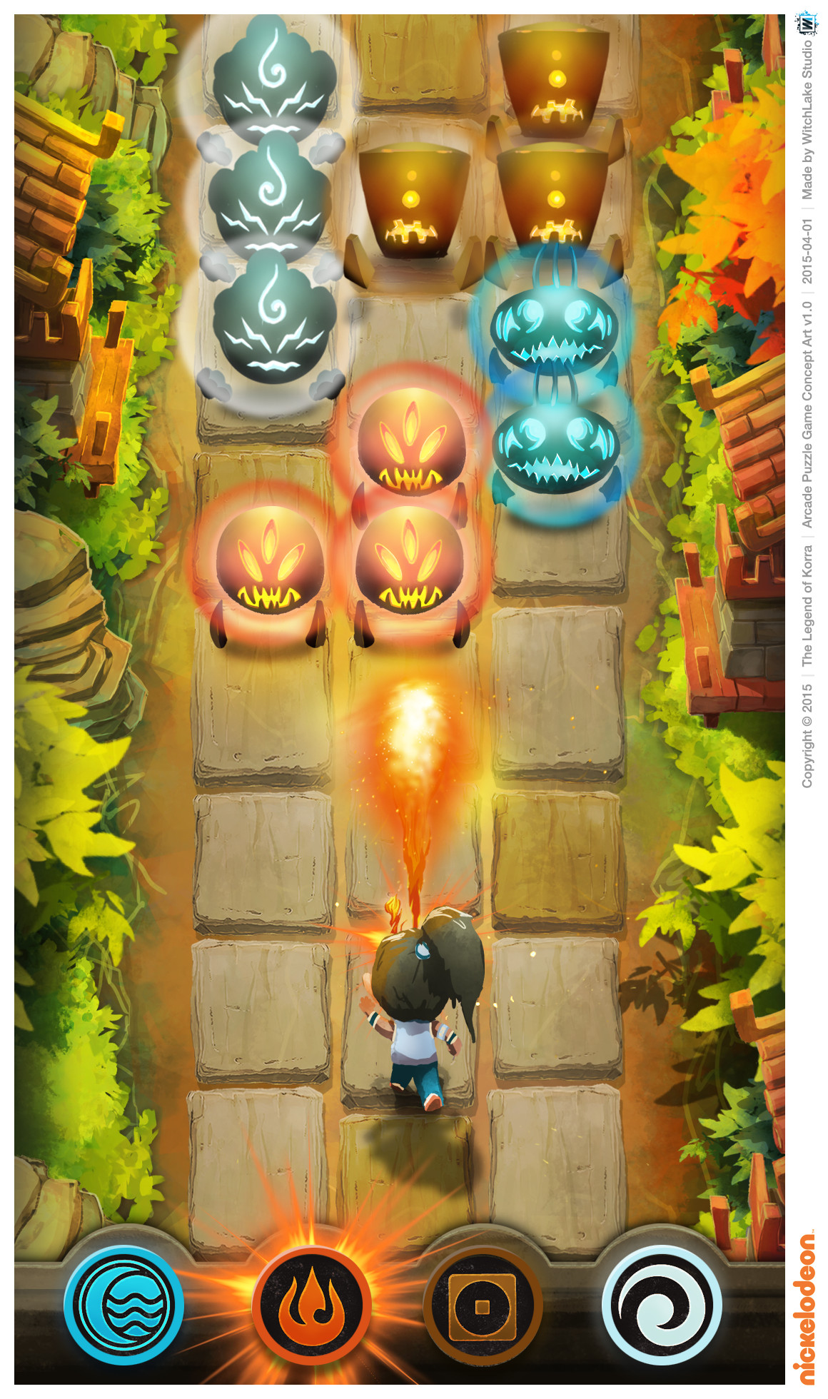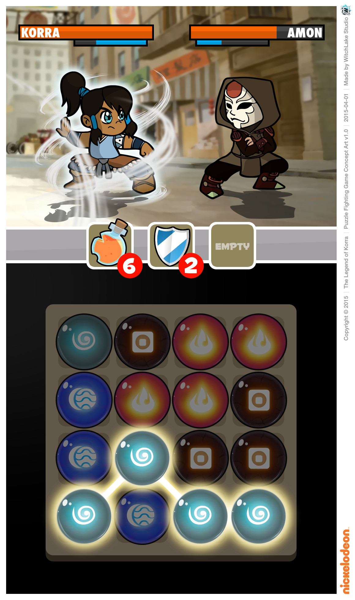 Between March and April 2015, Stéphane Donnet and I were in contact with Garrett Moehring, Senior Director of Games Content Development & Developer Relations at Nickelodeon, to explore ideas for a game based on The Legend of Korra running on iOS and Android. I had never watched the animated series myself, but Stéphane and his brother Romane were big fans, so I took the time to research it. We came up with several concepts and ultimately pitched five very different game ideas, complete with descriptions and mockups.