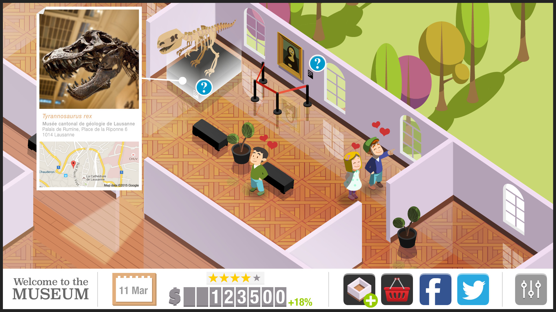 Visitors had their own satisfaction levels (represented by adorable floating hearts), and the player's challenge was to keep them engaged by expanding collections, improving attractions, and making smart business decisions. A well-run museum meant higher ratings, more revenue, and a growing reputation!